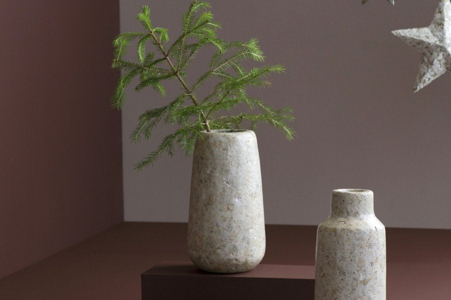 This product is made from capiz pulp and a recycled plastic bottle. Capiz pulp is made from the residual material from the capiz production. Capiz is a fairly flat translucent shell found in large quantities in the sea around the Philippines. Pieces of capiz remain in the production of Kinta’s capiz products, which are recycled into capiz pulp products. The capiz pulp together with old newspaper pulp is applied on a recycled plastic bottle. The bottle inside ensures that the vases and flowerpots are waterproof. We recommend not to fill the vase more than to the half. Do not wash or soak the vase in water.